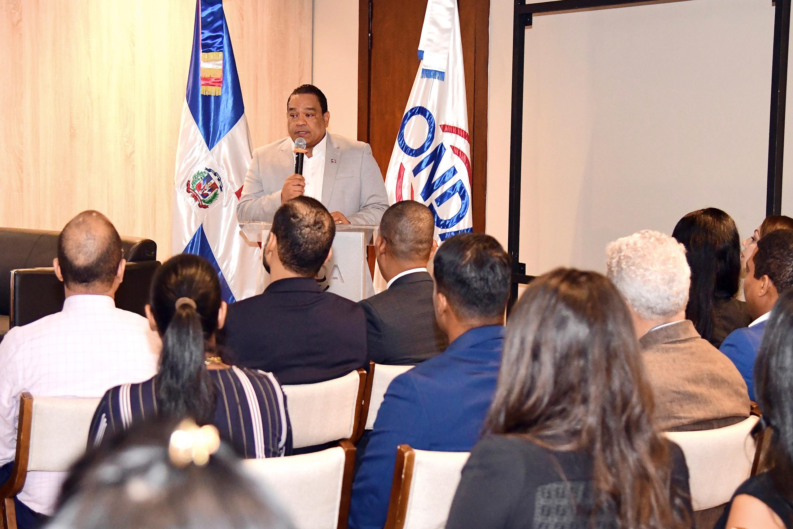 - José Ruben Gonell Cosme, director general de la ONDA, y Lilly Acevedo, presidenta de ADOPI junto expositores y panelistas.