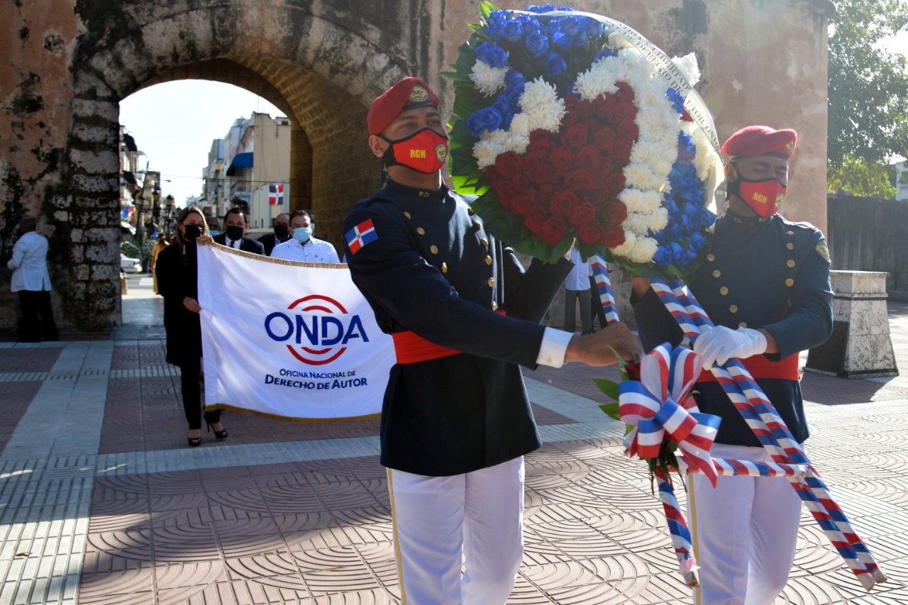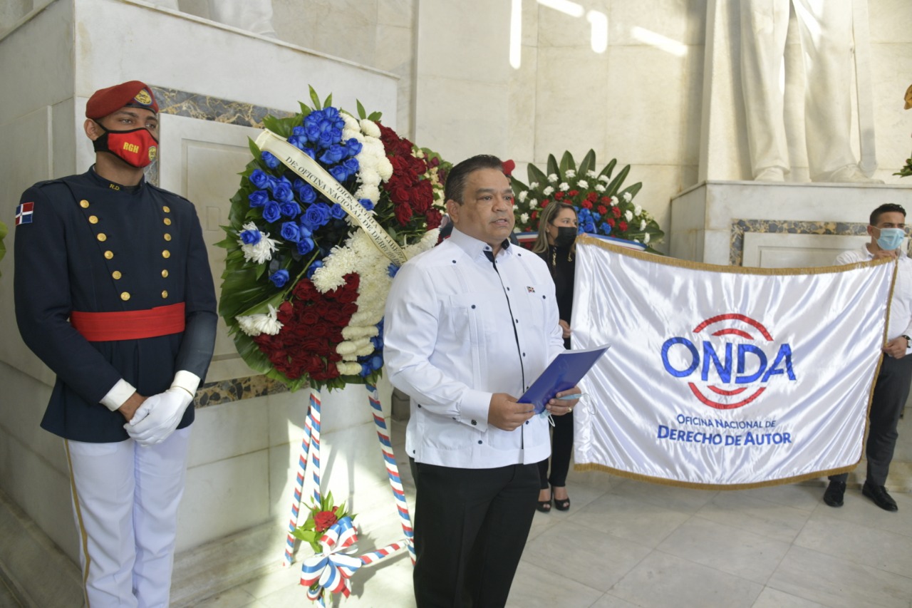 SANTO DOMINGO.-La Oficina Nacional de Derecho de Autor (ONDA), depositó hoy una ofrenda floral en el Altar de la Patria, con motivo de celebrarse el Mes de la Patria, donde el director general de la institución, licenciado José Ruben Gonell Cosme, destacó el arrojo y la valentía de los forjadores de la nacionalidad dominicana.